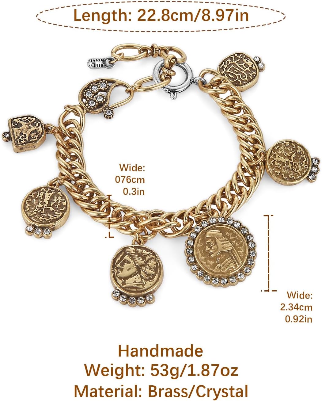 Discover the perfect blend of faith and fashion with the HZMAN Vintage Jesus Coin Cuban Link Bracelet. This striking piece features an intricately detailed Jesus coin pendant set against a substantial Cuban link chain, creating a powerful statement of belief and style. Crafted with an antique-style finish that enhances every detail, this handmade brass cuff carries the warmth and character of timeless religious artifacts. The substantial construction weighs 53g with a length of 8.97 inches, offering a comfortable yet meaningful presence on the wrist.Product Highlights:Religious Significance: Features a detailed Jesus coin medallion that serves as a testament to faith and devotionVintage Craftsmanship: Beautiful antique-style finishing gives this piece an heirloom quality with historical charmHandmade Artistry: Each bracelet is meticulously handmade, ensuring unique character and superior attention to detailSubstantial Construction: The classic Cuban link design provides weight and presence without compromising comfortVersatile Unisex Design: Perfect for both men and women who appreciate meaningful jewelry with spiritual significanceMeaningful Gift Choice: An ideal unisex gift idea for baptisms, confirmations, holidays, or as a symbol of protection and faith